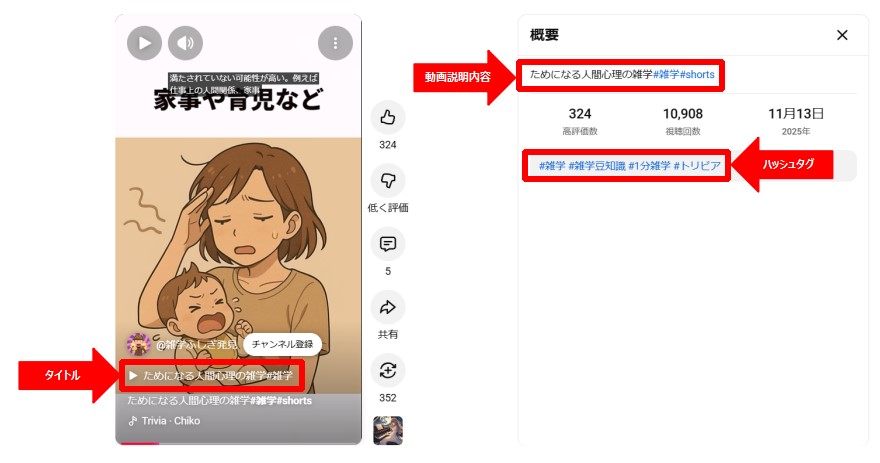 YouTubeに雑学動画を投稿する場合、下図のように「タイトル」「説明内容」「ハッシュタグ」を考える必要があります。