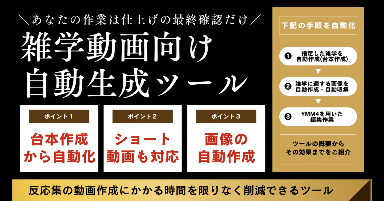 ちなみに、上記手順の➁から⑥を自動化できるツールとして「雑学動画向け自動生成ツール」があります。